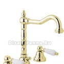 Назначение: для умывальника • Конструкция: двухрычажный • Монтаж: вертикальный • Клапан: керамический • Материал: латунь, покрытие - золото • Подводка: жесткая • Монтажные отверстия: 3 отверстия • Форма излива: традиционная • Душевая лейка в комплекте: нет • Аэратор: есть • Донный клапан в комплекте: есть