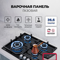 Поверхность: варочная панель • Тип поверхности: газовая • Рабочая поверхность: закаленное стекло • Число конфорок: 4 • Установка: независимая • Газовые конфорки: всего - 4 • Тип управления: механическое • Переключатели: поворотные • Электроподжиг: есть, автоматический • Размеры: 600x510x95 мм • Размер ниши для встраивания: 560x480 мм • Цвет: панель - черный