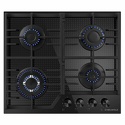 Поверхность: варочная панель • Тип поверхности: газовая • Рабочая поверхность: закаленное стекло • Число конфорок: 4 • Установка: независимая • Газовые конфорки: всего - 4 (1 конфорка "Тройная корона") • Газ-контроль конфорок: есть • Тип управления: механическое • Переключатели: поворотные • Электроподжиг: есть, автоматический • Размеры: 590x515x51 мм • Размер ниши для встраивания: 560x485 мм