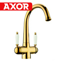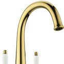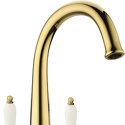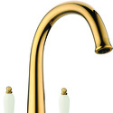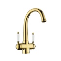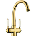 Комплектация - Смеситель, комплект подводки, полный набор креплений для подключения, инструкция, гарантийный талон, салфетка из микрофибры, Тип - Двухзахватный, Количество монтажных отверстий - 1, Материал корпуса - Латунь, Ширина - 15.2, Назначение - Для мойки, Тип подводки - Гибкая, Коллекция - Luxury, Покрытие - Золото, Присоединительный размер - 1\2", Форма излива - Традиционная, Поворотный излив - Да, Аэратор - Есть, Цвет - Золотистый, Длина излива - 200, Высота излива - 197, Высота - 30