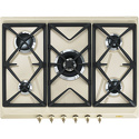 Поверхность: варочная панель • Тип поверхности: газовая • Рабочая поверхность: эмаль • Число конфорок: 5 • Установка: независимая • Газовые конфорки: всего - 5 (1 конфорка "Двойная корона") • Газ-контроль конфорок: есть • Тип управления: механическое • Переключатели: поворотные • Электроподжиг: есть, автоматический • Размеры: 685x500x32 мм • Размер ниши для встраивания: 560x482 мм • Цвет: панель - кремовый