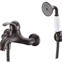 Назначение: ванна+душ • Конструкция: однорычажный • Монтаж: вертикальный • Клапан: керамический • Материал: латунь, покрытие - бронза • Подводка: жесткая • Монтажные отверстия: 2 отверстия • Форма излива: традиционная • Душевая лейка в комплекте: есть • Держатель для душевой лейки: настенный держатель • Аэратор: есть